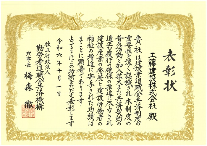 令和6年度建設雇用改善推進表彰式において、弊社が建設業退職金共済制度普及協力事業所として表彰して頂きました!
