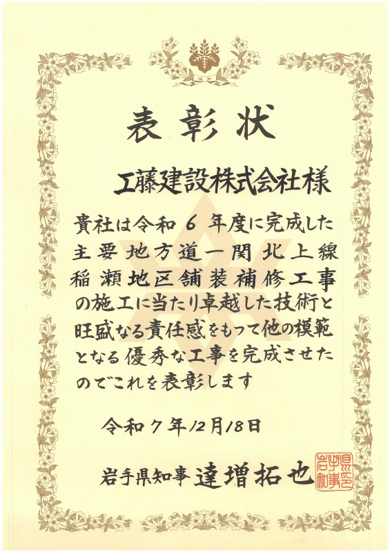 この表彰制度は、県の建設業の健全な発展とその施工技術の向上に資することを目的としているとのことですので、工藤建設はこれからも技術力を高めていきたいと思います。