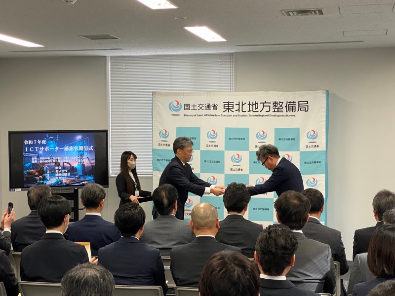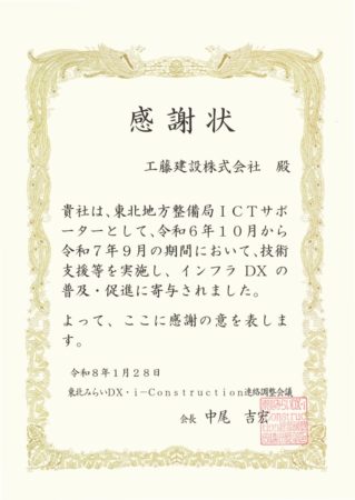 その活動が認められ、令和8年1月28日(水)に本制度の事務局である東北みらいDX・i-Construction連絡調整会議より、感謝状を頂きました!