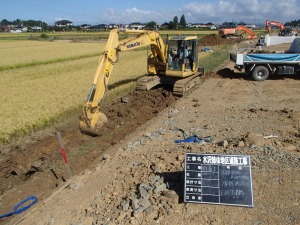 自社ICT建機を使って作業すると重機周りに作業員が居なくなります!小さな作業もICT化により安全確保を実施しています!