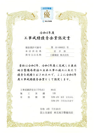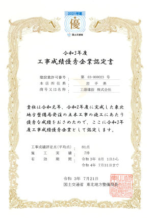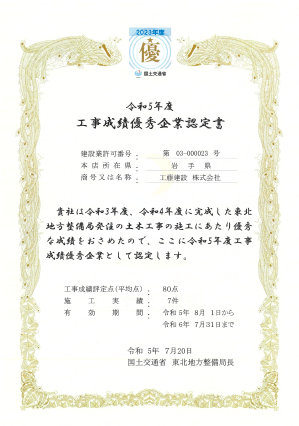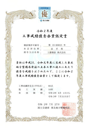 その施工能力を認められ、施工能力の優れた優良工事業者に与えられる「国土交通省 東北地方整備局 工事成績優秀企業認定書」を何度も受けています。